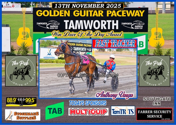 THE PUB DRIVE OF THE DAY: was won by ANTHONY VARGA driving Fast Tracker from the Winton Stables of Jamie Donovan in Race 8 the Club AGM - Monday 17th November Pace. ANTHONY receives a $30.00 Meal Voucher courtesy of sponsor The Pub, Gunnedah Rd Tamworth.