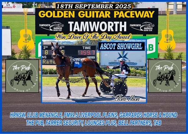THE PUB DRIVE OF THE DAY: was won by TOM ISON driving Ascot Showgirl from the on-site Stables of Dwayne Brown in Race 1 the The Download The TAB App Today Pace. TOM receives a $30.00 Meal Voucher courtesy of sponsor The Pub, Gunnedah Rd Tamworth.