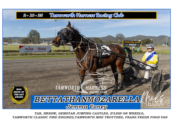 THE PUB DRIVE OF THE DAY: was won by JEMMA CONEY driving Bettathanmozzarella from the Reedy Creek (Singleton) Stables of Dean Ingold in Race 6 the Tamworth Classic Fire Engine Club Pace. JEMMA receives a $30.00 Meal Voucher courtesy of sponsor The Pub, Gunnedah Rd Tamworth.