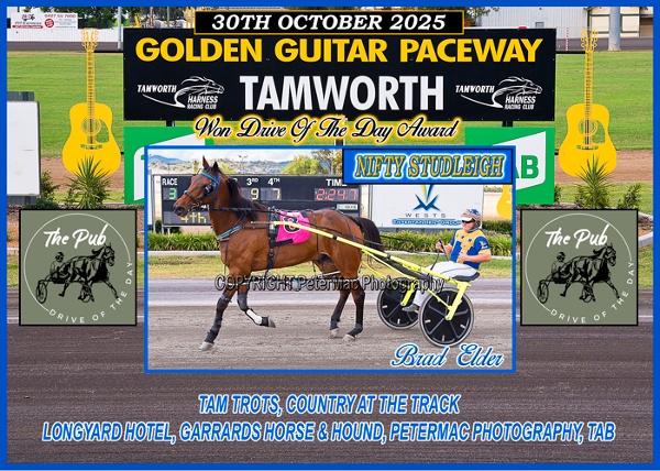 THE PUB DRIVE OF THE DAY: was won by BRAD ELDER driving Nifty Studleigh from his family's Louth Park Stables of in Race 3 the Garrard's Horse and Hound Pace. BRAD receives a $30.00 Meal Voucher courtesy of sponsor The Pub, Gunnedah Rd Tamworth.